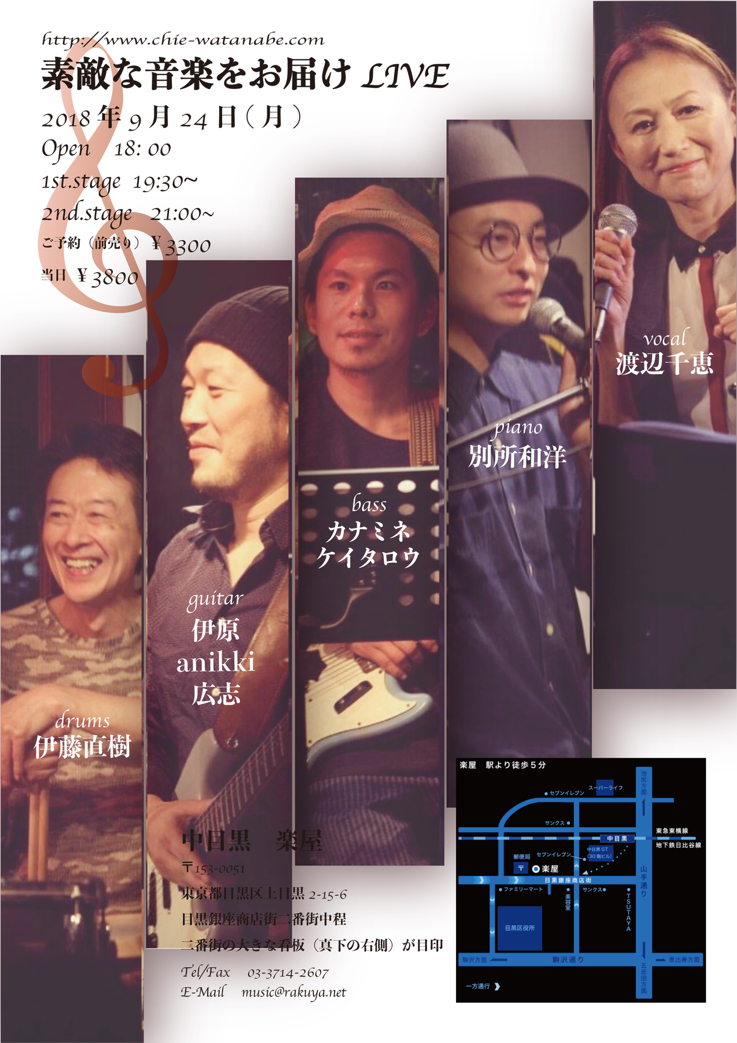 渡辺千恵 vo・別所和洋 piano・伊藤直樹 drum・カナミネケイタロウ bass・伊原anikki広 guitar